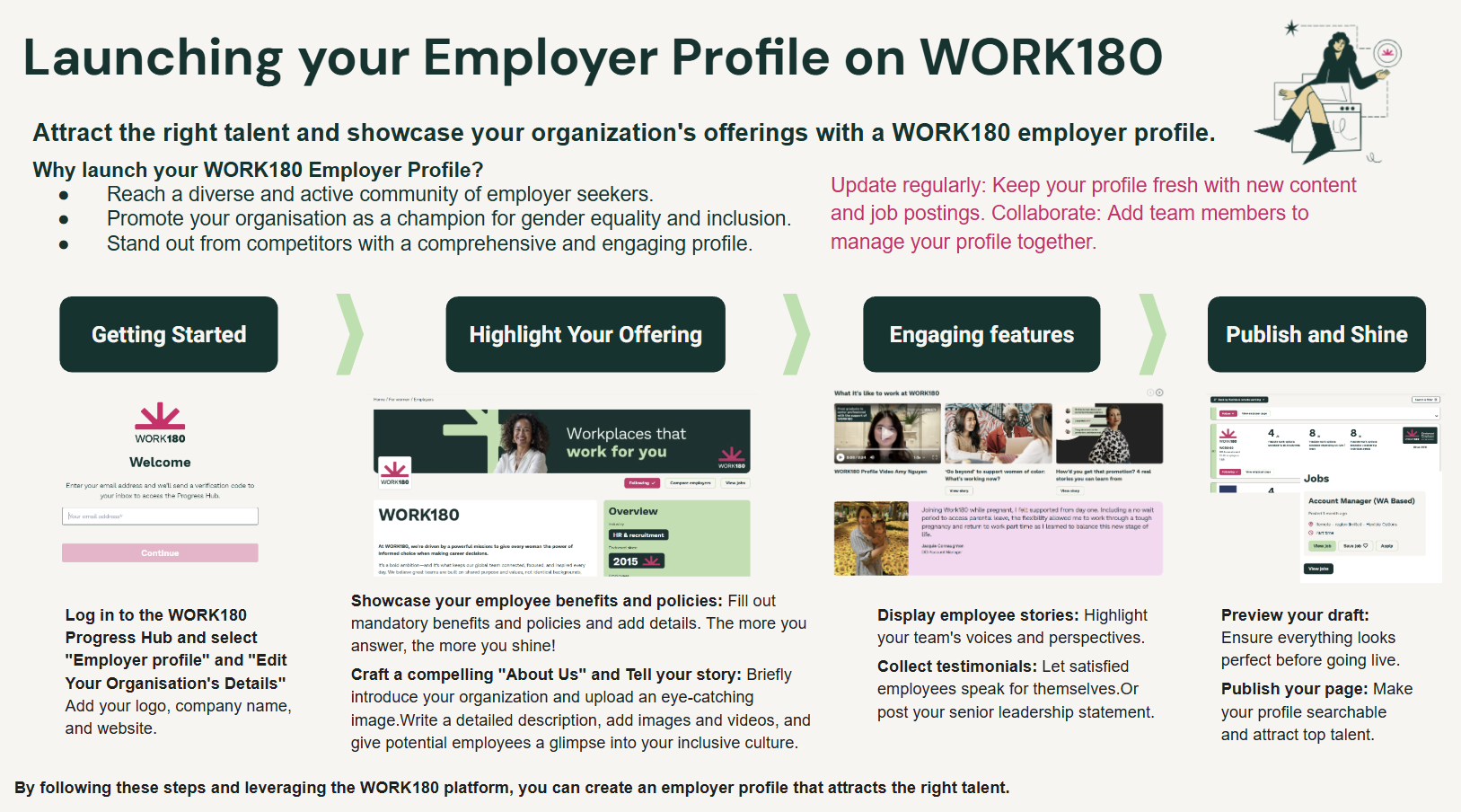 Your profile is your public showcase on WORK180 — where job seekers and followers discover who you are, what you offer, and how you support gender equity. It includes your company overview, benefits, culture insights, stories, testimonials, and open roles.